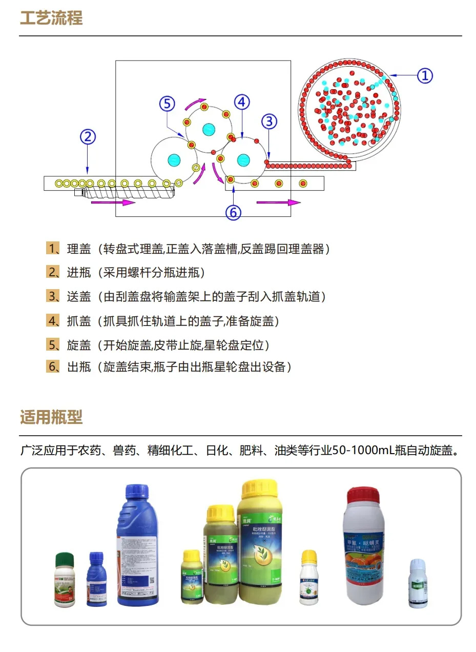 本機集進瓶、理蓋、旋蓋、出瓶與一體,采用抓蓋定位旋蓋,整機為回轉(zhuǎn)式結構。在旋蓋的過程中無傷瓶、無傷蓋現(xiàn)象、旋蓋效率高、合格率高、運轉(zhuǎn) 平穩(wěn)、使用范圍廣,可以和國外同類產(chǎn)品相媲美。該機適用于各種規(guī)格玻璃或塑料瓶的各種外蓋自動旋合,采用抓蓋器抓取刮蓋板輸送來的各種蓋子,在瓶子回轉(zhuǎn)過程中完成外蓋的旋合。整機采用PLC控制,觸摸式人機界面,操作方便直觀。