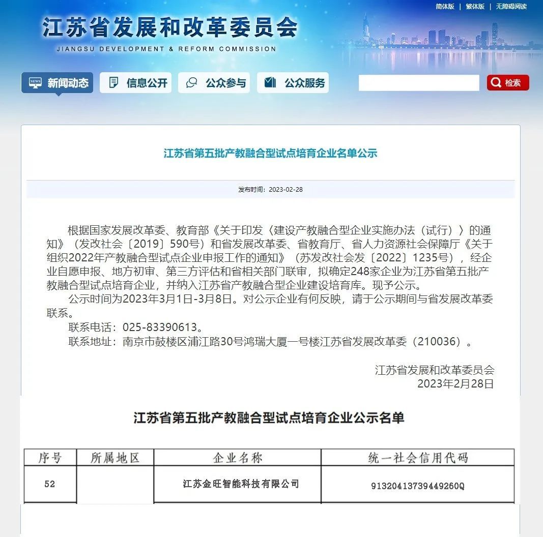 根據(jù)國家發(fā)展改革委、教育部《關(guān)于印發(fā)〈建設(shè)產(chǎn)教融合型企業(yè)實(shí)施辦法(試行)〉的通知》(發(fā)改社會〔2019〕590號)和省發(fā)展改革委、省教育廳、省人力資源社會保障廳《關(guān)于組織2022年產(chǎn)教融合型試點(diǎn)企業(yè)申報(bào)工作的通知》(蘇發(fā)改社會發(fā)〔2022〕1235號),經(jīng)企業(yè)自愿申報(bào)、地方初審、第三方評估和省相關(guān)部門聯(lián)審,擬確定248家企業(yè)為江蘇省第五批產(chǎn)教融合型試點(diǎn)培育企業(yè),并納入江蘇省產(chǎn)教融合型企業(yè)建設(shè)培育庫。金旺智能成功入選江蘇省產(chǎn)教融合型企業(yè)建設(shè)培育試點(diǎn)名單。