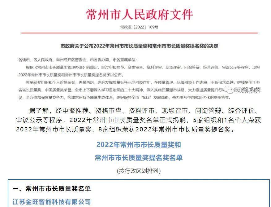 金旺智能始終堅持“智能、穩(wěn)定、高效、綠色”的理念,在質(zhì)量管理、持續(xù)創(chuàng)新、承擔(dān)社會責(zé)任、文化建設(shè)等方面取得了顯著成效。經(jīng)層層審核,金旺智能榮獲常州市最高質(zhì)量獎項——2022年常州市市長質(zhì)量獎。
