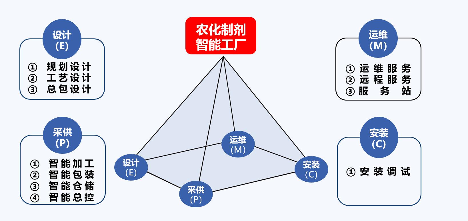 金旺的農(nóng)化制劑智能工廠四大維度簡(jiǎn)稱EPCM模式,第一個(gè)維度E即設(shè)計(jì),它包括規(guī)劃設(shè)計(jì)、工藝設(shè)計(jì)和總包設(shè)計(jì);第二個(gè)維度P即采供,它包括智能加工、智能包裝、智能倉(cāng)儲(chǔ)、智能總控;第三個(gè)維度C即安裝,它主要就是安裝調(diào)試;第四個(gè)維度M即運(yùn)維,它包括運(yùn)維服務(wù)、遠(yuǎn)程服務(wù)和服務(wù)站。