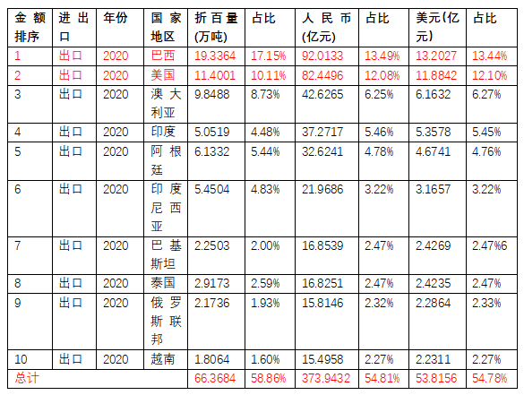 出口前十的國家占總出口的一半多。2020年,出口最多的是巴西和美國,占總出口數(shù)量的27%,總出口金額的25%。