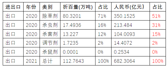 中國農(nóng)藥以出口為主,進口很少。年平均計算,10年來,農(nóng)藥出口95.2萬噸,進口2.6萬噸,進口量占總進出口量的2.7%;出口金額529.6億人民幣,進口金額38.1億人民幣,進口額占總進出口額的6.7%。