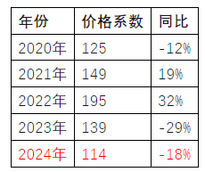 緊接著疫情后的兩年又出現(xiàn)了兩年大跌,其中2023年大跌了29%,2024年又下跌了18%,農(nóng)藥出口價格系數(shù)與2013年2014年持平,一夜回到了10年前。