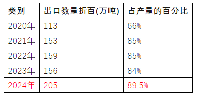 出口已占農(nóng)藥產(chǎn)量的九成。2024年農(nóng)藥出口數(shù)量達到歷史最高,高達205萬噸,比2023年出口數(shù)量多出近50萬噸,同比增長了32%。出口占產(chǎn)量的比重由近3年的85%又提高了5個百分點,達到了近90%。