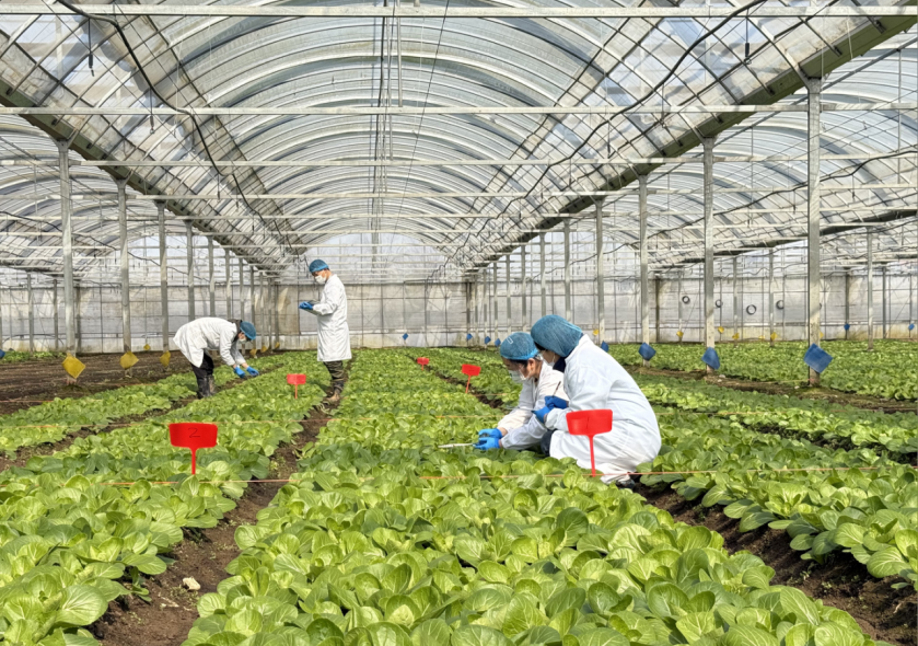 硅羿科技團(tuán)隊成員在浦東新區(qū)試驗田現(xiàn)場測試十字花科蔬菜殺蟲劑的效能