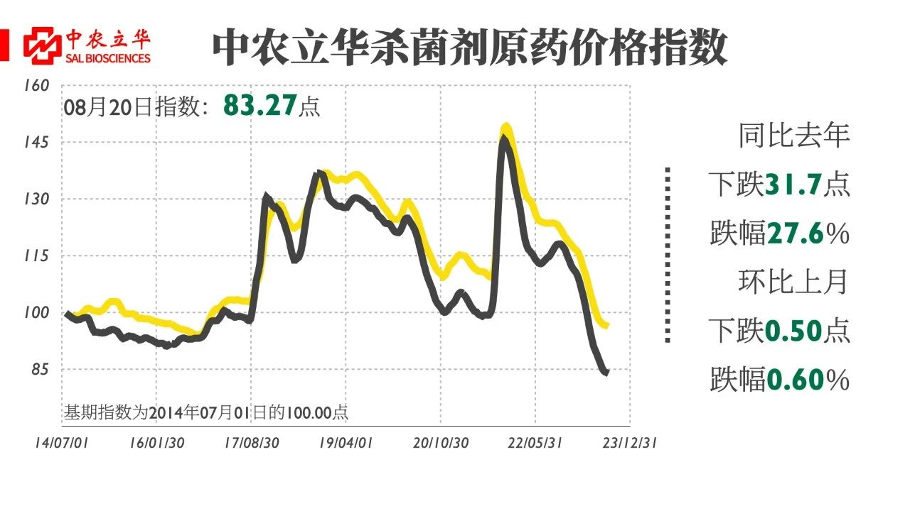 2023年8月20日,中農(nóng)立華殺菌劑原藥價(jià)格指數(shù)報(bào)83.27點(diǎn),同比去年大跌27.6%,環(huán)比上月跌幅0.60%。殺菌劑市場(chǎng)維持弱勢(shì)運(yùn)行態(tài)勢(shì),需求穩(wěn)定釋放,部分品種廠家開(kāi)工率降低,原材料價(jià)格有所上行,市場(chǎng)關(guān)注度及補(bǔ)貨意愿強(qiáng)。