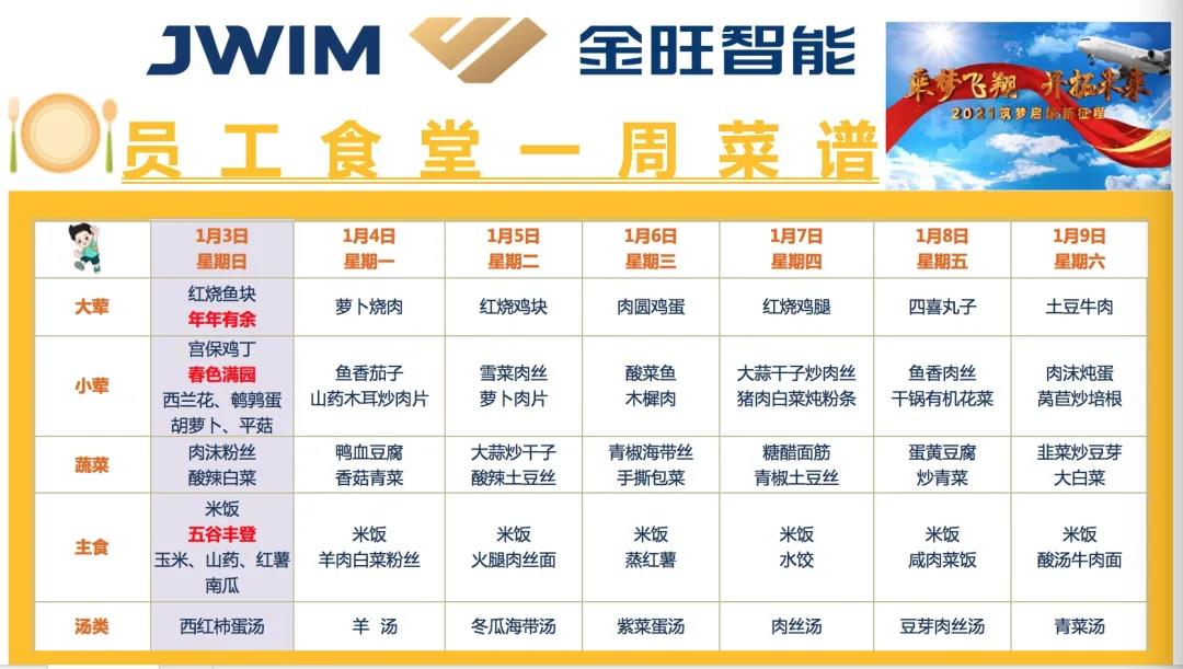 “今日菜單:土豆牛腩、青椒肉絲、紅燒蝦、魚香雞絲、西蘭花胡蘿卜、青菜香菇、西湖牛肉羹、番茄雞蛋湯,外加粗糧玉米山藥”……每天中午11點左右,金旺員工就會在微信群收到諸如此類的圖文并茂的菜譜,外加詼諧幽默的美食美言,如此這般食欲便悄然氤氳開來