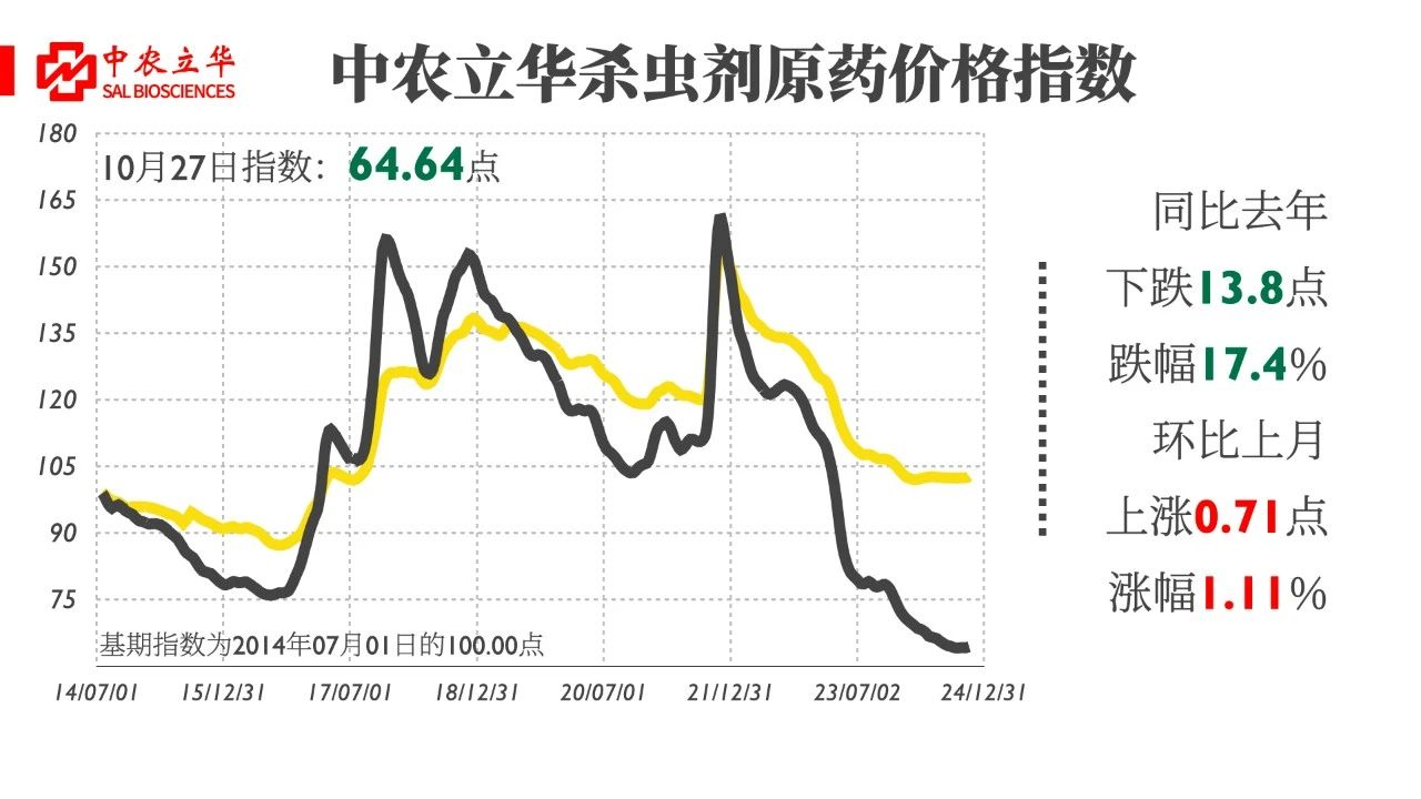 2024年10月27日,中農(nóng)立華殺蟲劑原藥價格指數(shù)報64.64點,同比去年下跌17.4%,環(huán)比上月上漲1.11%。殺蟲劑市場詢盤活躍度增加,部分產(chǎn)品供貨緊張,如阿維菌素,甲氨基阿維菌素苯甲酸鹽原藥供需失衡,期貨排單較多;其他品種交投活躍度上升,剛需疊加冬儲備貨,市場信心修復(fù)中。