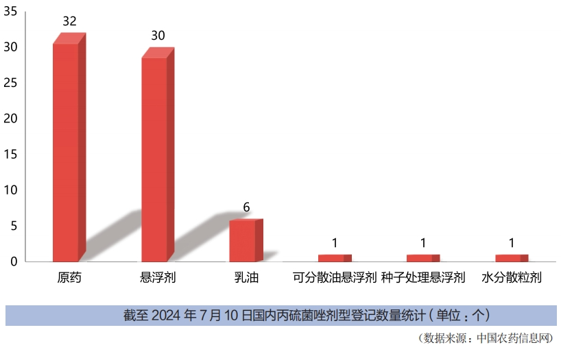 中國農(nóng)藥信息網(wǎng)顯示,截至2024年7月10日,丙硫菌唑在國內(nèi)登記產(chǎn)品達(dá)到69個(gè),其中,單劑7個(gè),原藥達(dá)到32個(gè),混劑30個(gè)。制劑劑型主要有懸浮劑、可分散油懸浮劑、種子處理懸浮劑和專供出口的乳油制劑。目前,這些產(chǎn)品主要登記在小麥和花生兩種作物上,用于小麥赤霉病、白粉病和銹病以及花生白絹病的防治。