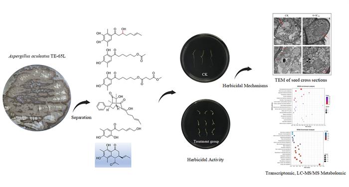 該團(tuán)隊(duì)篩選到一株對多種單子葉和雙子葉雜草具有顯著除草活性的棘孢曲霉TE-65L,從其發(fā)酵產(chǎn)物中獲得了5個新型山梨素類化合物。通過波譜分析光譜計算,確定了該類化合物的化學(xué)結(jié)構(gòu),并首次發(fā)現(xiàn)了其對雜草的除草活性,其中2個化合物能夠顯著抑制牛筋草胚芽和胚根的伸長,其活性均強(qiáng)于陽性藥草甘膦。研究表明,該類化合物能夠誘導(dǎo)木質(zhì)素生物合成途徑,導(dǎo)致木質(zhì)素積累,并引起雜草種子細(xì)胞壁增厚,抑制雜草的生長。該研究獲得了具有自主知識產(chǎn)權(quán)的天然除草劑分子模板,擴(kuò)展了天然產(chǎn)物除草劑的結(jié)構(gòu)類型,拓寬了山梨素類化合物的農(nóng)業(yè)應(yīng)用途徑。