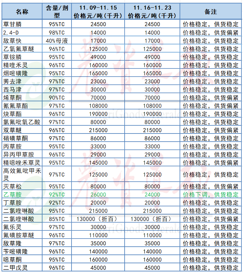 上周(11月16~23日),農藥市場整體保持相對偏弱,交投低迷,產品價格波動不大,穩(wěn)定為主,市場觀望情緒較濃,上游廠家有一定的庫存,部分產品市場以消耗庫存為主;少數產品廠家開工低下,市場貨源偏緊,價格保持相對堅挺;部分產品市場需求極度疲軟,價格出現走弱的趨勢;當前上游生產商、渠道商以及下游終端保持謹慎策略,按需采購為主。