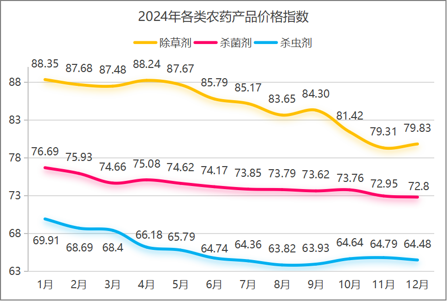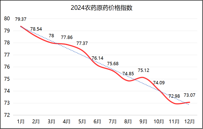 四季度,雖然已至下游“冬儲(chǔ)”時(shí)間節(jié)點(diǎn),但受多重因素影響,下游備貨積極性不高,國(guó)內(nèi)農(nóng)藥市場(chǎng)進(jìn)入“休整期”,需求相對(duì)低迷,外貿(mào)需求也偏弱。截至2024年12月底,原藥價(jià)格指數(shù)報(bào)73.07點(diǎn),同比下跌9.78%,65%的產(chǎn)品價(jià)格下跌。全年來看,農(nóng)藥市場(chǎng)受季節(jié)變化、環(huán)保政策、國(guó)際形勢(shì)等多重因素影響,價(jià)格波動(dòng)大,供需關(guān)系緊張,市場(chǎng)交投活躍度與價(jià)格走勢(shì)隨季節(jié)及需求變化而波動(dòng)。