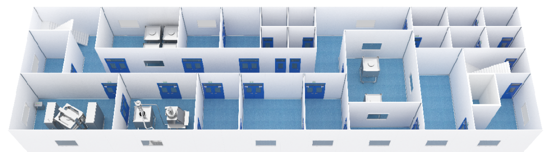 按照獸藥GMP標(biāo)準(zhǔn)及工藝流程,整個(gè)車間采用二層布局,一層包裝,二層物料加工和各種功能間。
