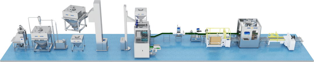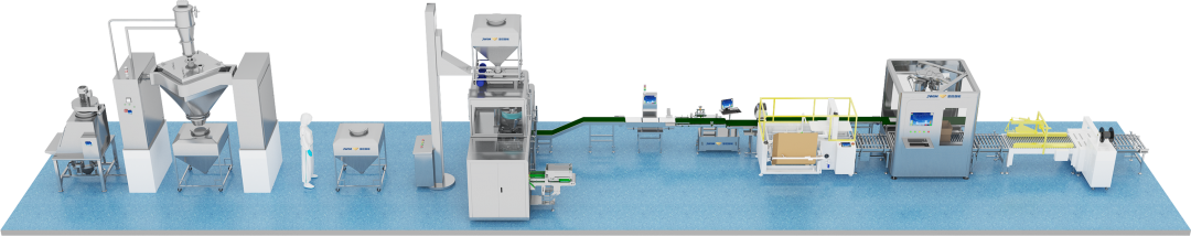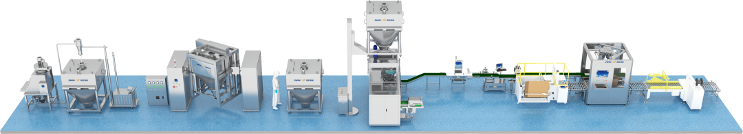 整個(gè)工藝流程從物料脫包、物料干燥、粉碎過篩、稱重配料、無塵投料、預(yù)混、轉(zhuǎn)運(yùn)、自動(dòng)包裝、檢測(cè)裝置、二維碼采集關(guān)聯(lián)、自動(dòng)封箱打包、自動(dòng)碼垛等設(shè)計(jì),均采用自動(dòng)化、智能化設(shè)計(jì),有效提升產(chǎn)品品質(zhì),提高生產(chǎn)效率!