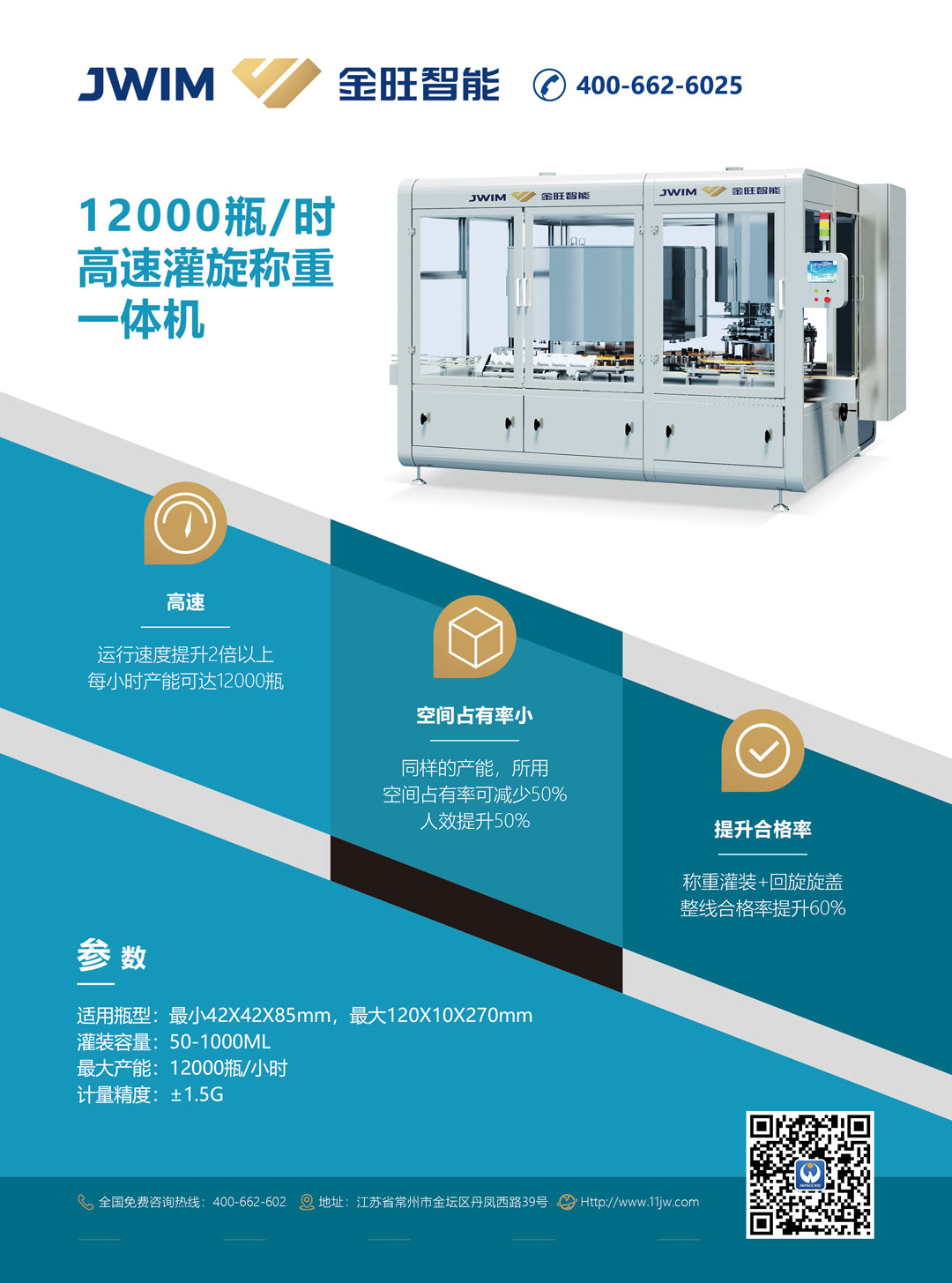 隨著農(nóng)化市場(chǎng)50-1000ml的懸浮劑、水劑、乳油和水溶肥等液體包裝的不斷發(fā)展壯大,客戶對(duì)液體包裝產(chǎn)品的質(zhì)量、整線的生產(chǎn)效率、改善包裝衛(wèi)生條件及運(yùn)營(yíng)成本更加注重,因此成本、可行性、性能優(yōu)劣、效率等都將決定包裝設(shè)備在市場(chǎng)上的競(jìng)爭(zhēng)力。今年,金旺研發(fā)了一款全新智能"GX24-10CAH稱重式灌旋一體機(jī)",該設(shè)備能夠完成在線稱重灌裝及旋蓋的全過程,基于金旺十幾年的農(nóng)化灌裝技術(shù)沉淀,可根本上保障并實(shí)現(xiàn)稱重灌裝技術(shù)的應(yīng)用。